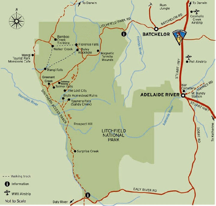 332km from Darwin to Katherine - driving time 4 hours comfortable. Litchfield