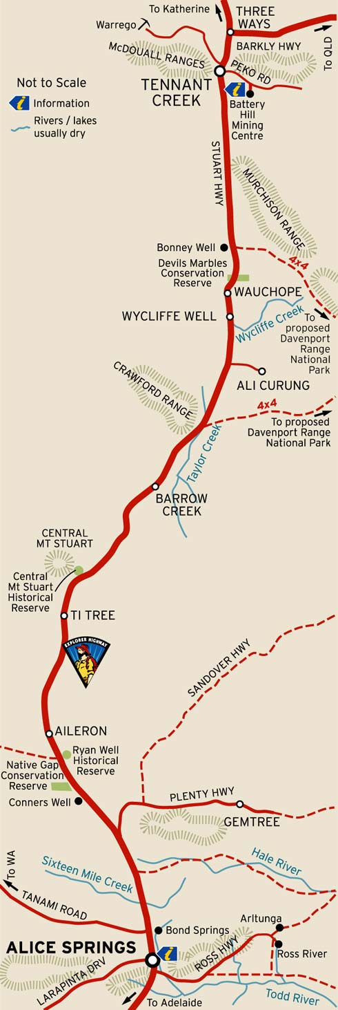 | A map of Stuart Highway south from Darwin or north from Alice Springs. |