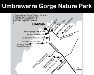 Opening times: • Daily, possible road closures after heavy rains. Activities: • Off Road Driving • Camping • Swimming • Animal Viewing • Self-Guided" Facilities: • BBQ Facilities • Car park • Picnic Area • Public Toilet How to get to Umbrawarra Gorge Nature Park The Park is located about 245 km from Darwin and about 115 km from Katherine. Drive along the Stuart Highway to about 3 km south of Pine Creek. Then turn south west onto an unsealed road. The next 22 km can become very dusty and corrugated. This section contains steep dips and creek crossings. Drive with care. It is best to visit in the dry season, (May to September) when the river level has dropped and the gorge is accessible. Roads - the Park can be reached by all vehicles in the dry season (May - September). Towing caravans along this road is not recommended due to the corrugations. During the wet season (October - April), especially after rain, the road is often closed. Consult maps and check road conditions on 1800 246 199 prior to your visit. Umbrawarra supports significant colonies of the Short-eared Rock-wallaby and the Rock Ringtailed Possum. Keen bushwalkers will almost certainly catch a glimpse of some of these native marsupials Visitor Facilities The campground has a • A small campground with a pit-toilet is only a short distance from the gorge entrance. A pit toilet (don't ask - a pit toilet or as we say long drop box is a deep hole with a toilet on top of it) • picnic facilities • barbecue facilities • car park • Camping fees apply and should be deposited in the honesty box provided. Umbrawarra Gorge Nature Park activities Rocky pools and small sandy beaches provide beautiful swimming spots, early to mid-dry season only. The creek stops flowing late in the dry season. An easy 1km walk leads into the Gorge, but if you want to go further along the creek you will have to swim and rock-hop. There are magnificent views from the cliff-tops. For rock climbing and abseiling, permits must be obtained from the Batchelor or Palmerston Parks and Wildlife Services offices before you arrive at Umbrawarra. Umbrawarra Gorge Nature Park blog: I did this back in the 1990's in a hilux and the road was alright for some of the way then there was a incline and it got corrogated and narrow so becareful. At the crest the view over the Umbrawarra Gorge was quiet well 'Outback'. So is Umbrawarra Gorge on the Jatbula Trail. |